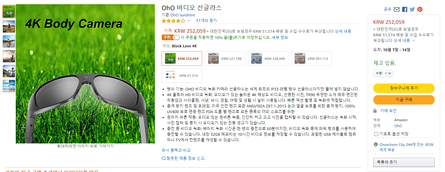 OhO 비디오 선글라스는 아마존에서 252.059원에 판매하고 있으며,배송비는 한국직배송가능한 제품으로 배송 및 수입수수료는 5만원정도입니다. OhO 카메라 선글라스는 저장용량에 따라, 그리고 색상에 따라 가격의 차이가 있습니다. 아마존 회원가입을 안하신분들은 아래 포스팅을 참고하시면 쉽고 간단하게 회원가입절차를 진행하실 수 있습니다.