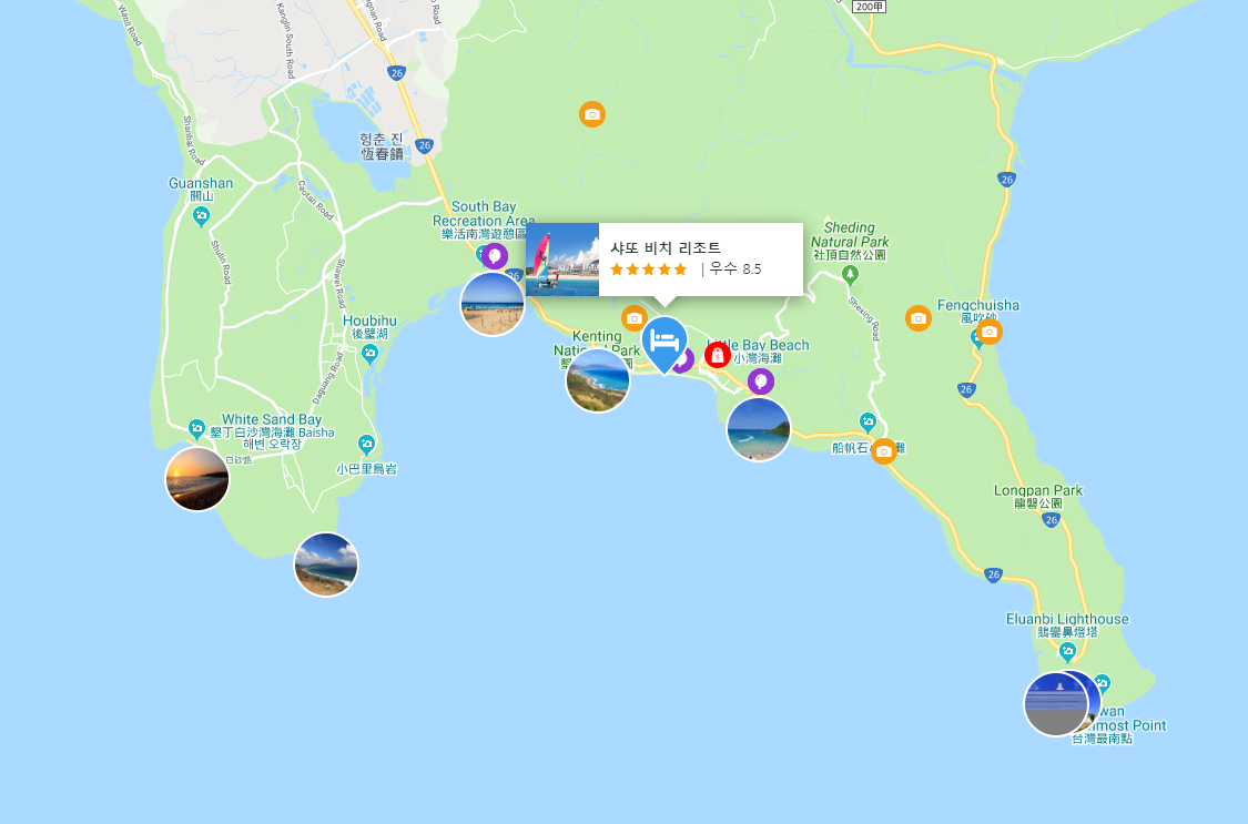 대만 샤또 비치 리조트 (Chateau Beach Resort)는 가오슝공항에서 83km 거리에 있으며, 관광명소촨판스, 엘루안비등대까지는 10분전후 시간이 걸립니다.