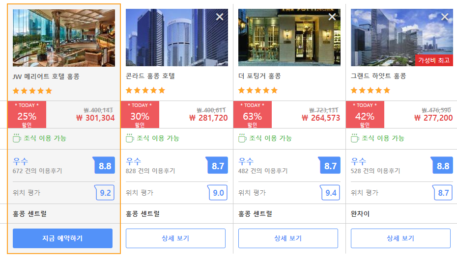 JW 메리어트 호텔 홍콩 (JW Marriott Hotel Hong Kong)의 최저 가격대는 아고다에서 할인특가 가격으로 매일매일 변동되며 20만원대부터 다양하게 형성됩니다. 아고다 최저가를 확인하시려면 아래 링크를 누르시면 원하는 날짜의 가격대를 자세히 보실 수 있습니다.