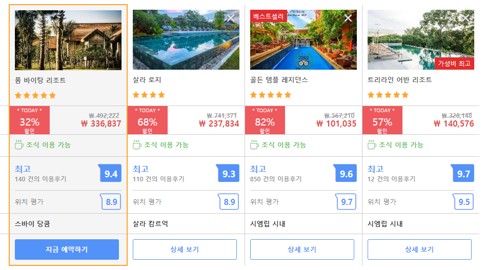 씨엠립 품 바이탕 리조트 (Phum Baitang Resort)의 최저 가격대는 아고다에서 할인특가 가격으로 매일매일 변동되며 20만원대부터 다양하게 형성됩니다. 아고다 최저가를 확인하시려면 아래 링크를 누르시면 원하는 날짜의 가격대를 자세히 보실 수 있습니다.