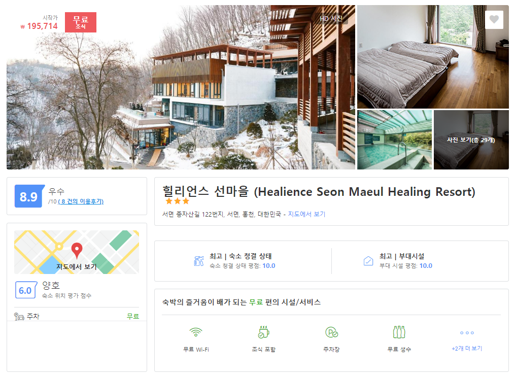 홍천 힐리언스 선마을 (Healience Seon Maeul Healing Resort)의 최저 가격대는 아고다에서 할인특가 가격으로 매일매일 변동되며 10만원대부터 다양하게 형성됩니다.아고다 최저가를 확인하시려면 아래 링크를 누르시면 원하는 날짜의 가격대를 자세히 보실 수 있습니다.