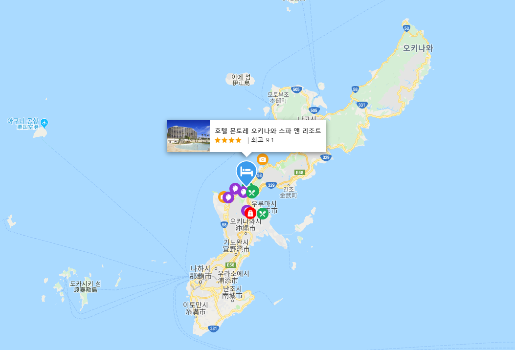 오키나와호텔 몬토레오키나와스파앤리조트는 아메리칸빌리지에서 30 ~ 40분정도 걸리는 곳으로,모던하고 깔끔한 호텔입니다. 옥외수영장도 멋지도 비치가 바로앞에 있어이동을 힘든 가족여행시 주변환경좋은 호텔이라 생각이 됩니다. 위치는 오키나와 중간쯤에 있어 위아래 관광다니기에도 좋은 오키나와호텔몬토레오키나와스파앤리조트(Hotel Monterey Okinawa Spa and Resort)입니다.
