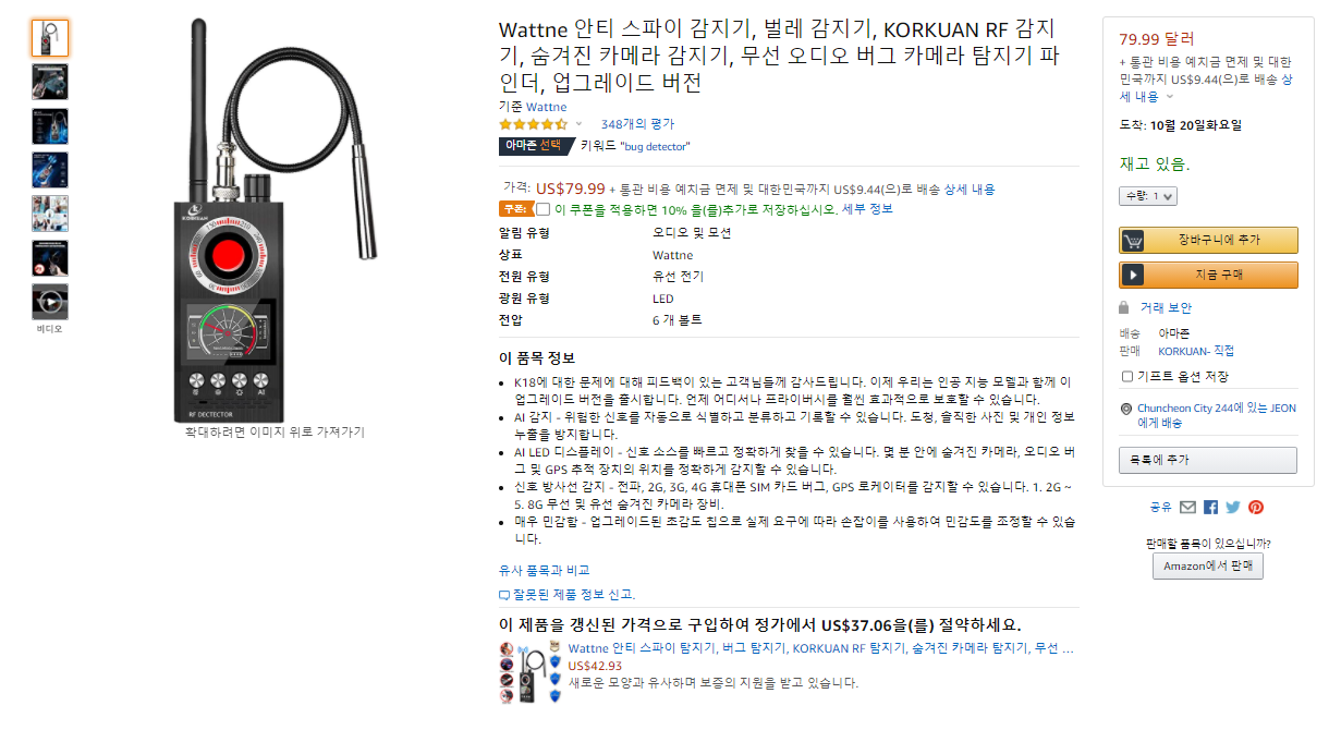KORKUAN RF 감지기(Wattne Anti Spy Detector)는 아마존에서 79.99달러에 구매가 가능하며 한국으로 직배송 가능한 제품으로 한국으로 배송시 배송료는 9.44달러입니다. 아마존사이트에 회원가입을 안하신분들은 아래쪽 회원가입 가이드 포스팅을 참고하시면 쉽게 회원가입 및 직구를 하실 수 있습니다.