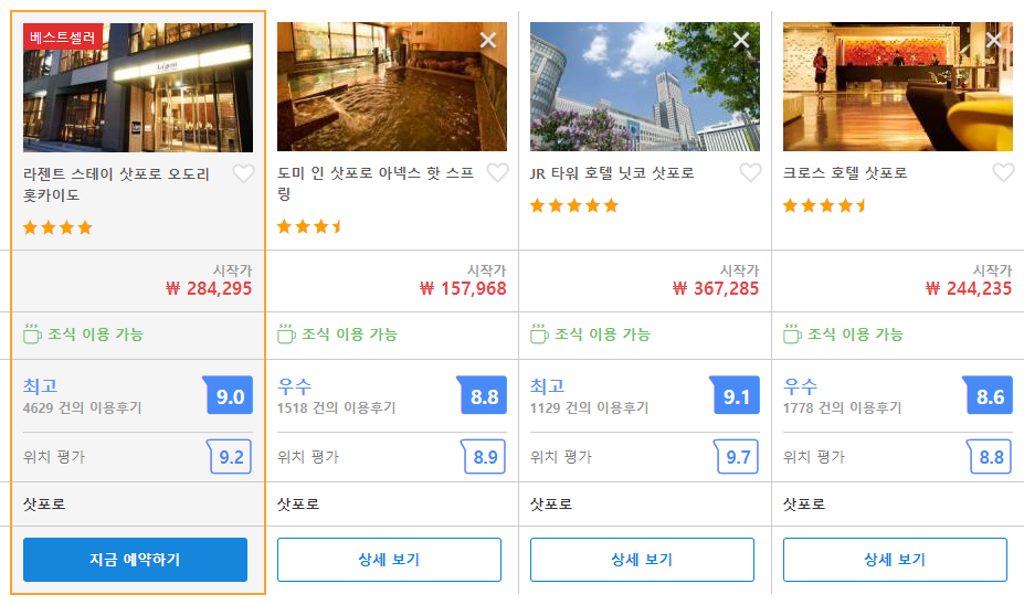 호텔선택기준-위치>퀄리티(대욕장필수)>조식>비용 인데, 위치는 정말 짱 좋음, 스스키노에서 5분거리에있고, 돈키호테는바로앞~쫌더앞엔 다이소~ 두손가득 쇼핑하고 호텔에 넣어두고 다시쇼핑하고~ 정말 좋았어요~(삿포로역에선 보도15분정도?) 호텔안에 대욕장도있어서, 일어나서~자기전에 온천하고 너무 개운하고 좋음~ 조식은 기대보다 화려하진 않았지만, 다른 호텔에비해 훌륭한편!!! 우유푸딩 또 먹고싶어요!!ㅠ 직원분들도 친절했고, 위생상태도 너무좋았고~ 혼자서 호강하고 왔네요~ 삿포로 가면 다시 여기서 묶을겁니다~ ^^
