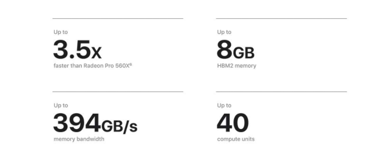 3D 렌더링 또는 하이엔드 게임 개발 같은 그래픽 집약적인 프로젝트 작업을 위해 MacBook Pro에 옵션인 Radeon Pro 5600M을 과대 충전할 수 있습니다. 40개의 컴퓨팅 장치와 8GB의 고대역폭 메모리를 갖춘 이 강력한 GPU는 MacBook Pro에 새로운 수준의 데스크탑급 그래픽 기능을 제공합니다.