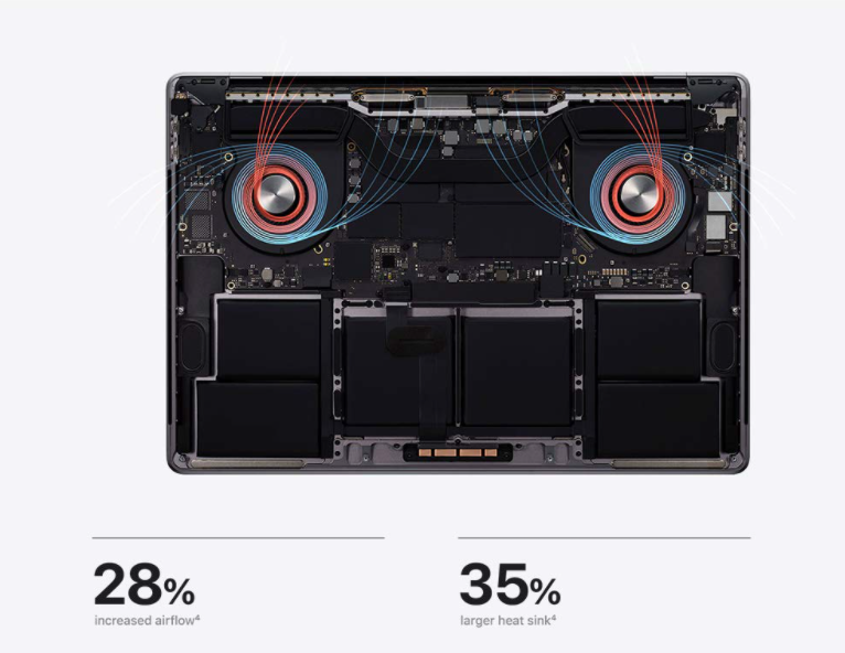 보다 진보된 열 아키텍처를 통해 보다 빠른 처리가 가능합니다. 맥북 프로의 열 아키텍처는 공기 흐름을 최적화하기 위해 개선된 팬 블레이드를 갖춘 대형 임펠러와 보다 효과적인 냉각을 위해 더 많은 열 방출 핀을 갖춘 완전히 재설계되었습니다. 결과적으로 냉각 용량이 증가함에 따라 MacBook Pro는 최대 12와트 이상의 지속 전력을 제공할 수 있습니다.