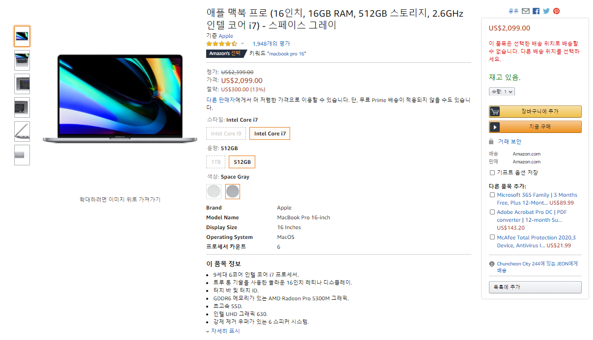 애플맥북 // 아마존가 $2,099 애플 맥북 프로 9세대 6코어 인텔 코어 i7, 16인치, 16GB RAM, 512GB 스토리지