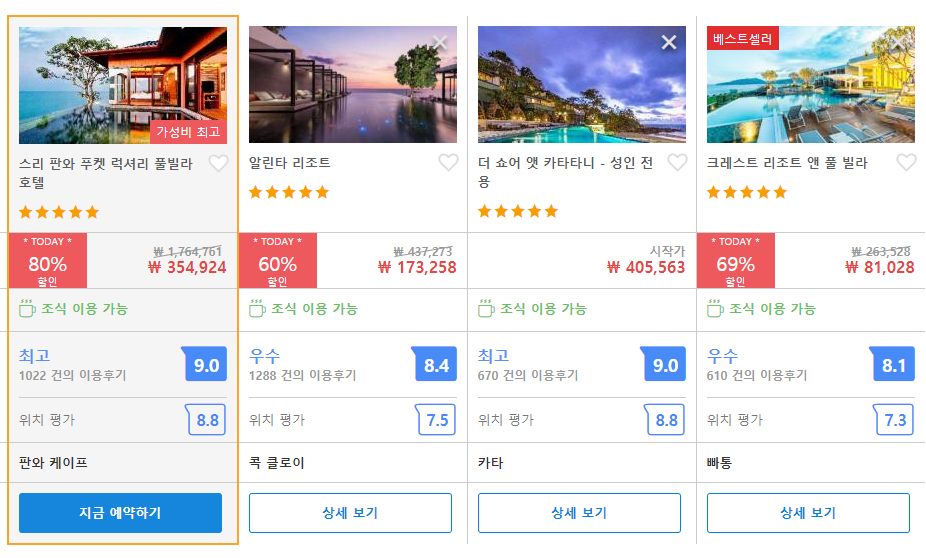 스리 판와 푸켓 럭셔리 풀빌라 호텔 (Sri Panwa Phuket Luxury Pool Villa Hotel)의 최저 가격대는 아고다에서 할인특가 가격으로 매일매일 변동되며 30만원대부터 다양하게 형성됩니다. 아고다 최저가를 확인하시려면 아래 링크를 누르시면 원하는 날짜의 가격대를 자세히 보실 수 있습니다.