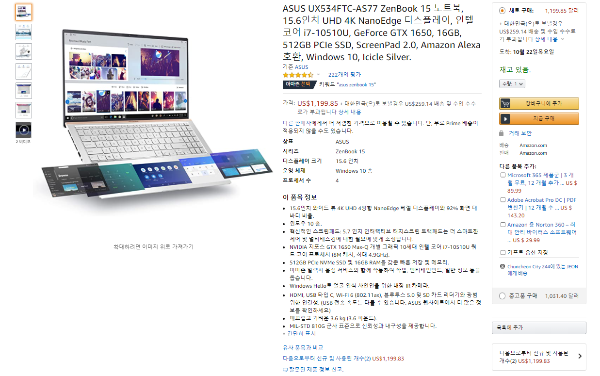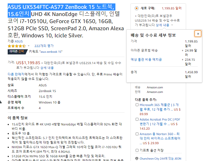 15.6인치 아수스 젠북(ASUS UX534FTC-AS77 ZenBook 15)은 아마존에서 1,199달러에 판매하고 있으며,한국으로 직배송 가능한 제품으로 배송료는 국제배송비 및 예상 통관 비용 예치금을 포함하여 259.14 달러 정도가 부가됩니다.