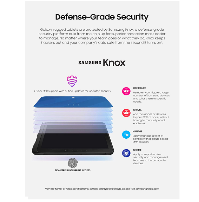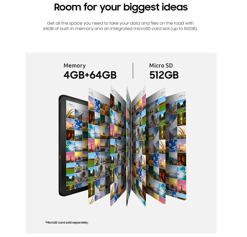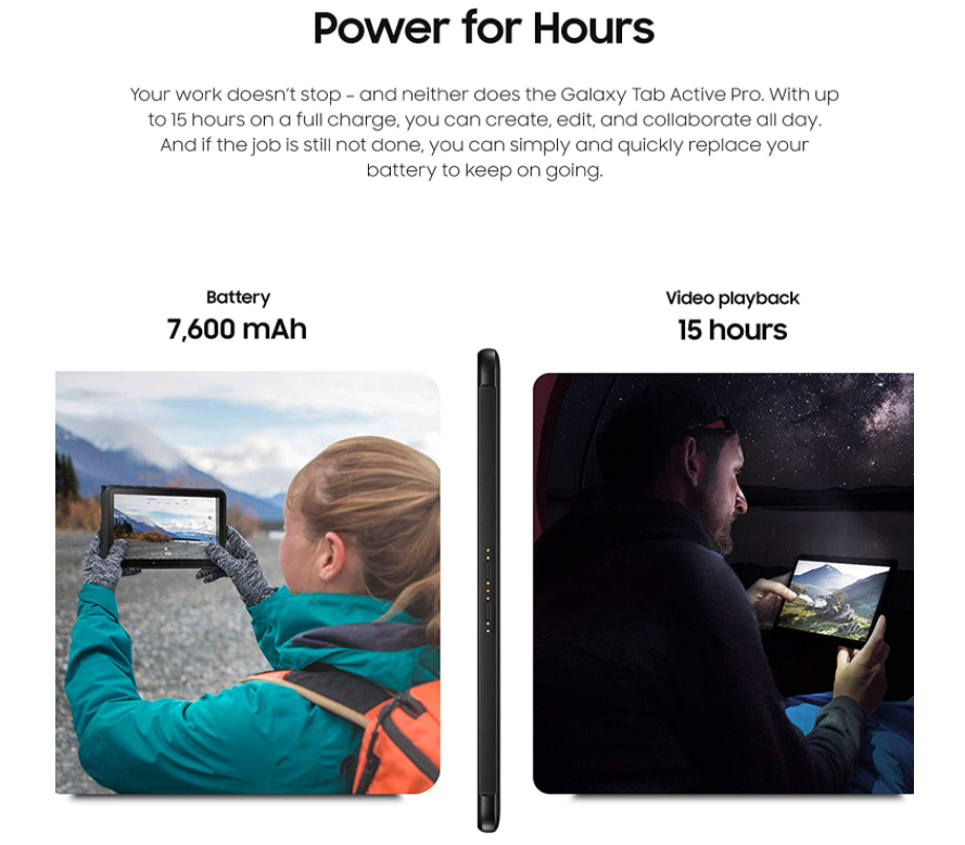 매우 견고한 — 10.1인치 Wi-Fi 지원 64GB 탭 액티브 프로 태블릿은 거친 조건에서도 견고합니다. 가속도계, GPS, 기압계, 지문 센서, 자이로 센서, 지자기 센서, 홀 센서, RGB 조명 se와 같은 내장 기능이 포함되어 있습니다.