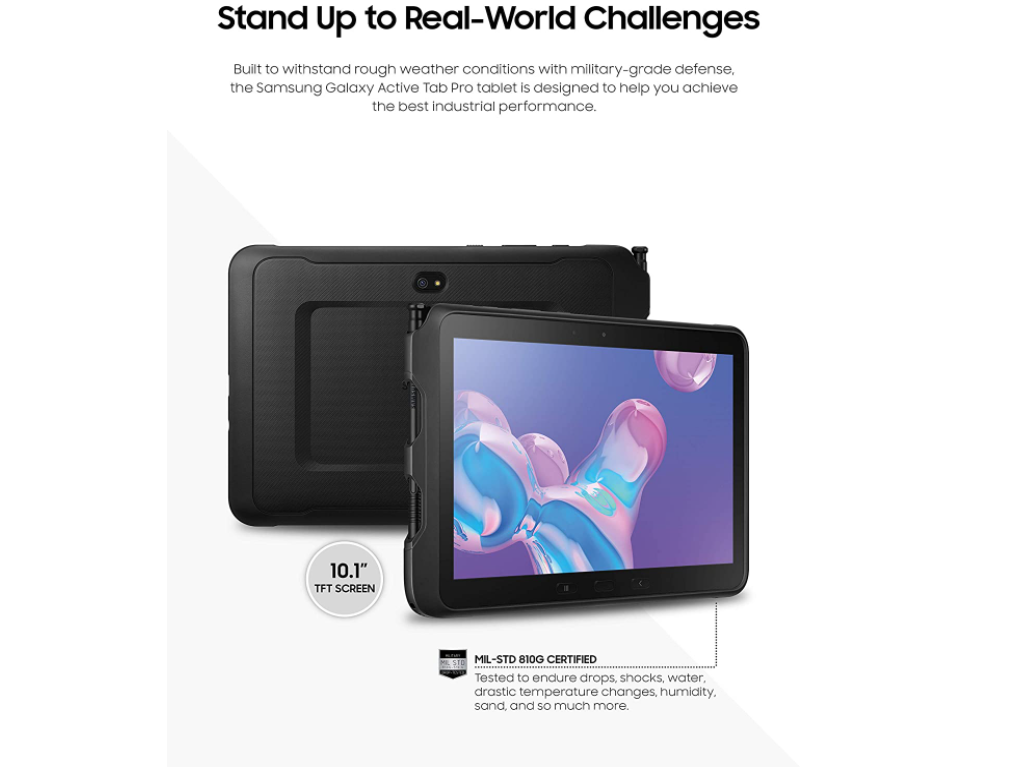 군용 등급의 방어로 거친 기상 조건을 견딜 수 있도록 설계된 삼성 갤럭시탭 액티브 프로 테블릿(Samsung Galaxy Tab Active Pro 태블릿)은 최고의 산업 성능을 달성 할 수 있도록 설계되었습니다. Galaxy Tab Active Pro는 MIL-STD-810G 및 IP68 인증을 받았습니다.