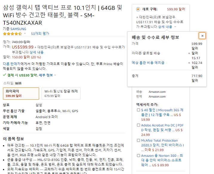 삼성 갤럭시탭 액티브 프로 xo블릿(Samsung Galaxy Tab Active Pro 태블릿)은 아마존에서 구매하시면 저렴하게 구매하실 수 있으며 와이파이버젼은 599,99달러, wifi와 lte 사용 버젼은 679.99달러입니다. 제품은 한국으로 직배송가능한 상품으로 한국으로 배송시 국제배송비 15.17달러와 예상통관 비용 예치금 102.74달러입니다.