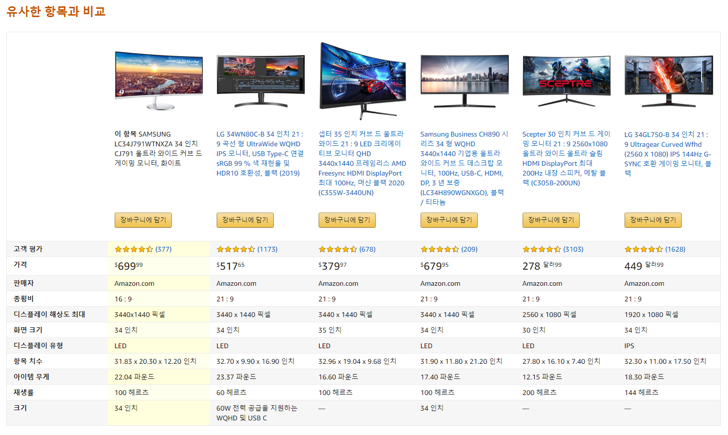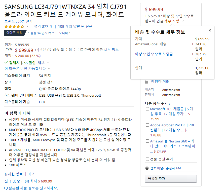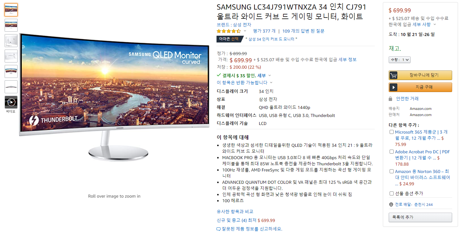 SAMSUNG LC34J791WTNXZA 34 인치 CJ791 울트라 와이드 커브 드 게이밍 모니터는 아마존에서 699.99달러에 판매하고 있으며, 아마존에서 한국으로 직배송가능한 제품으로 국제배송비와 예상 수입 수수료 보즘금을 합쳐 525.07달러입니다.