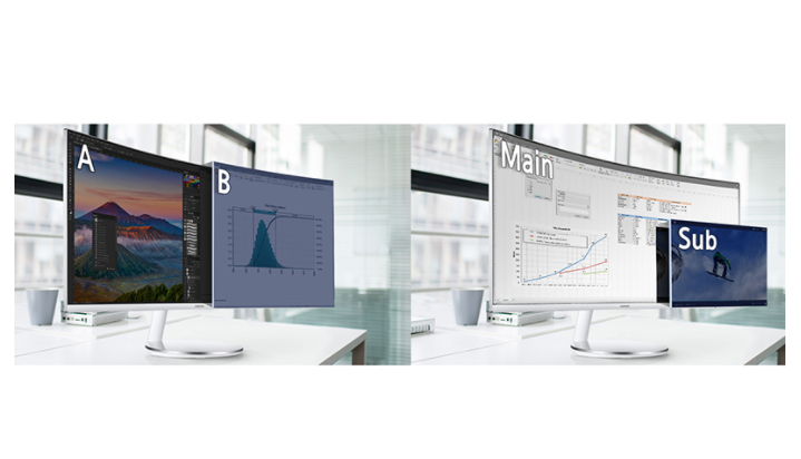 PBP (Picture-by-Picture)를 사용하면 기본 해상도로 화면에 두 개의 소스를 표시 할 수 있습니다. PIP (Picture-in-Picture)로 멀티 태스킹을 더욱 최적화 할 수 있습니다. 두 번째 소스의 크기를 화면의 최대 25 %까지 조정하고 원하는 위치에 배치 할 수 있습니다.