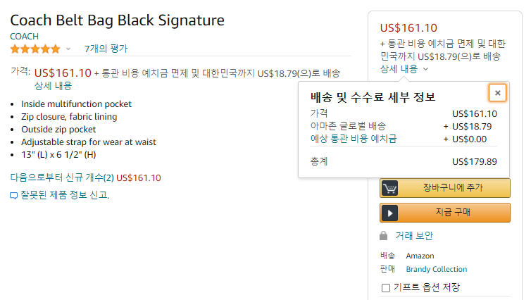 코치크로스백 벨트 백 블랙 시그니처(Coach Belt Bag Black Signature)는 아마존 사이트에서 161.1 달러에 판매하고 있으며 한국으로 직배송가능한 제품입니다. 추가비용으로는 국제배송비로 18.97달러이며, 200달러미만제품이라 예상 통관 비용 예치금은 없습니다.