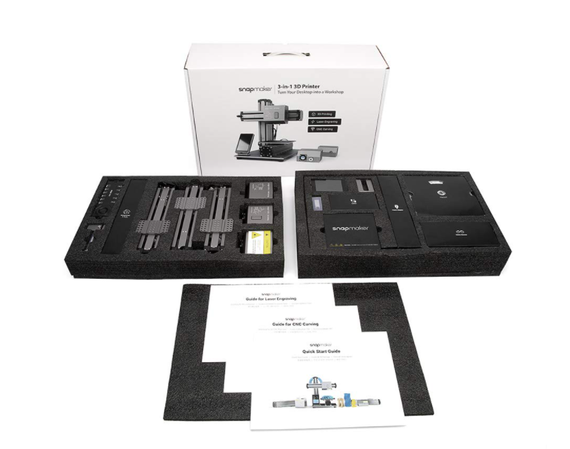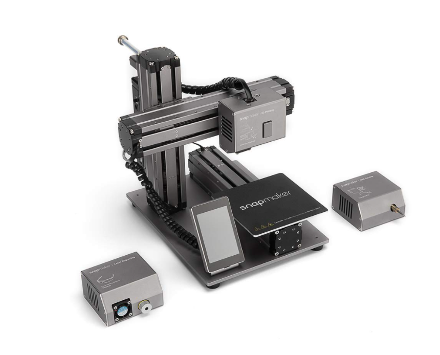 스냅메이커의 1세대 제품: Snapmaker 오리지널은 3개의 교체 가능한 기능 모듈, 3D 인쇄, CNC 조각 및 각인이 있습니다.