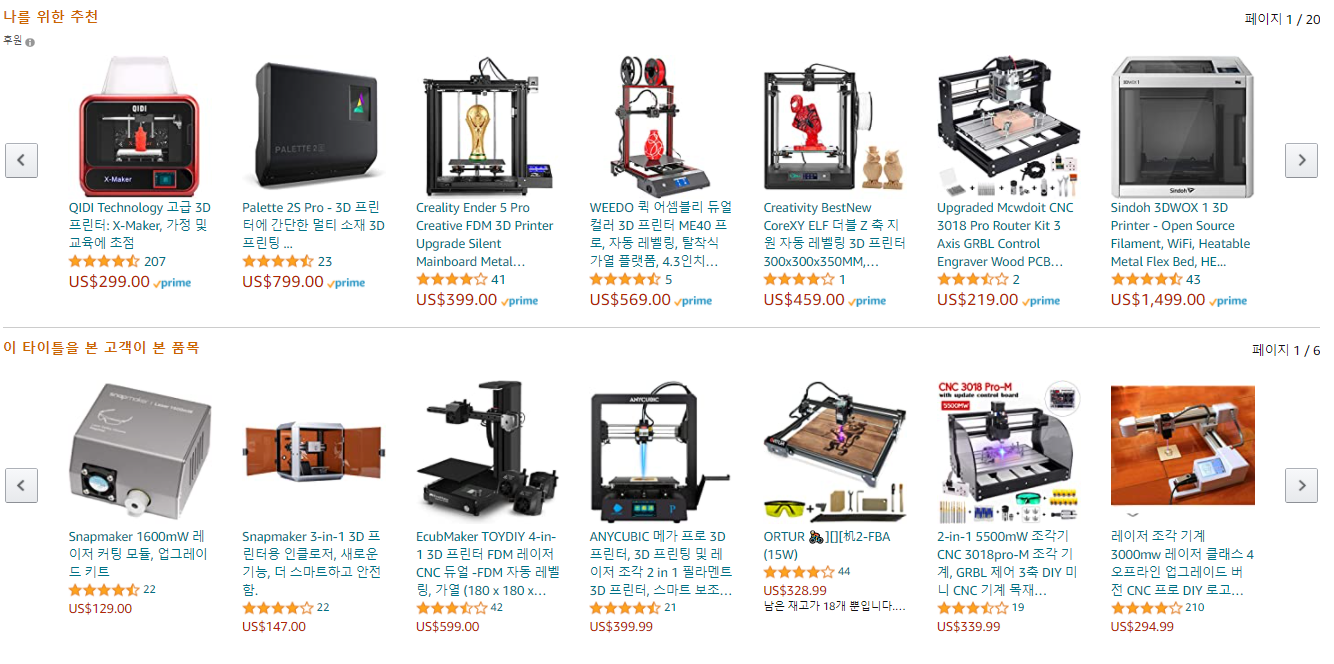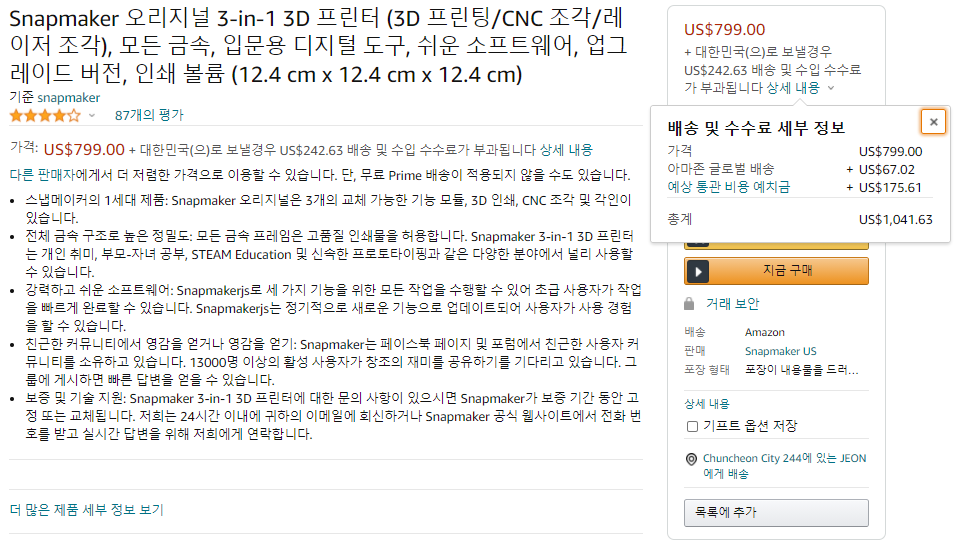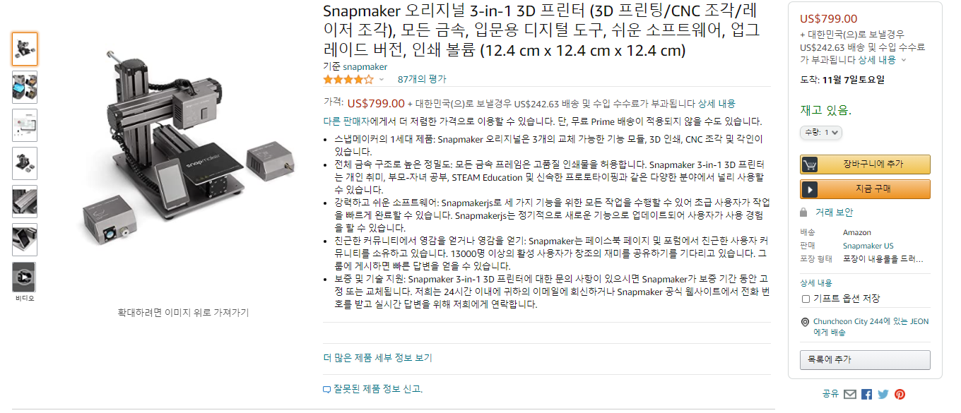 Snapmaker 오리지널 3-in-1 3D 프린터 (3D 프린팅/CNC 조각/레이저 조각), 모든 금속, 입문용 디지털 도구, 쉬운 소프트웨어, 업그레이드 버전, 인쇄 볼륨 (12.4 cm x 12.4 cm x 12.4 cm)은 아마존에서 799달러에 구매하실 수 있으며, 한국으로 직배송가능합니다. 한국으로 직배송시 국제배송비는 67.02달러 그리고 예상 통관 비용 예치금으로 174.61달러정도가 추가됩니다.