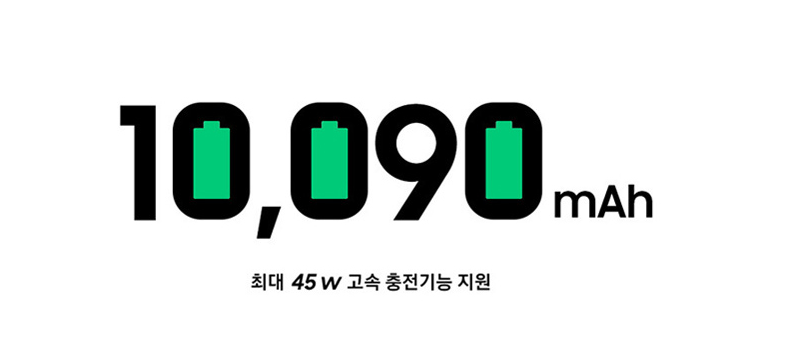 * 10,090 mAh (일반) 배터리는 갤럭시 탭 S7+ 에서만 사용할 수 있습니다. 타사 실험실 조건에서 | 테스트 한 표준값이며, 정격(최소) 용량은 더 적습니다. 표준 용량값은 IEC 61960 표준에 따라 테스트 된 배터리 샘플 간의 배터리 용량 편차를 고려한 측정 값입니다. 갤럭시 탭 S7+ 의 정격 (최소) 용량은 9,800 I mAh입니다. 실제 배터리 수명은 네트워크 환경, 사용 패턴 및 기타 요인에 따라 달라질 수 있습니다.