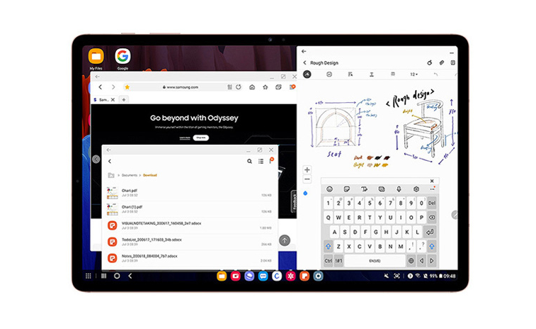 Samsung De X에서는 PC처럼 여러 개의 창을 띄워 멀티태스킹을 할 수 있어요. 최대 19개의 앱을 동시에 표시할 수 있고 키보드와 마우스가 더해지면 PC급 성능을 발휘합니다. 익숙한 업무 환경을 언제 어디서든 만나보세요.