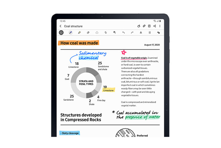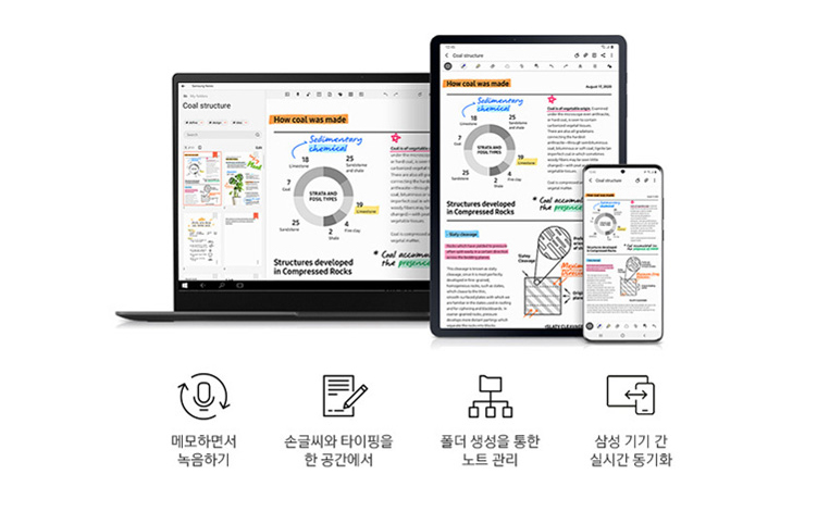 손글씨와 타이핑이 동시에 가능해졌습니다. 여기에 녹음 기능이 새롭게 추가되어 메모를 하면서 원하는 내용을 함께 녹음할 수도 있어요. 저장한 메모는 폴더로 깔끔하게 정리해보세요. 삼성 계정으로 로그인하면 스마트폰이나 노트북에도 메모가 동기화 돼