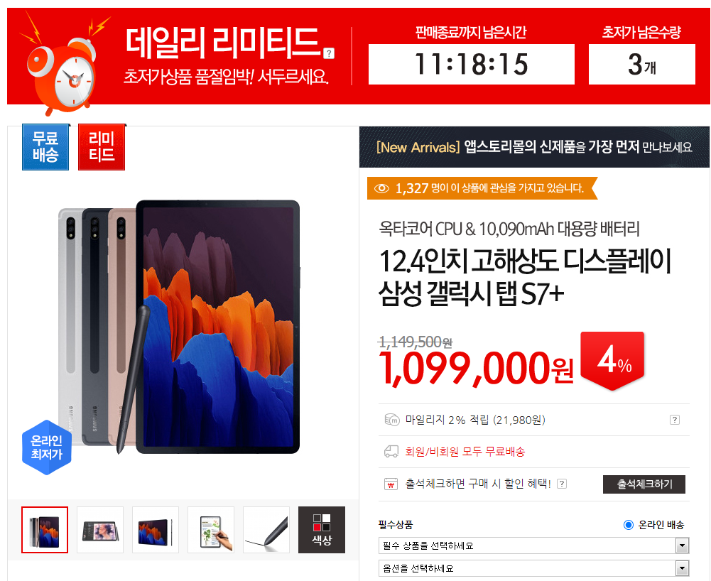 삼성 갤럭시 탭 S7+은 앱스토리몰에서 저렴하게 구매하실 수 있으며