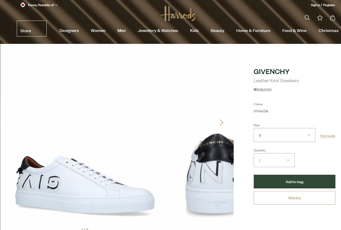 지방시스니커즈 Leather Knot Sneakers는 다양한 럭셔리 제품과 영국 왕실에 납품되는 상품들을 소개하는 영국의 대표 백화점, 헤롯백화점의 공식쇼핑몰에서 589달러에 판매하고 있으며 한국으로 직배송가능한 제품입니다. 헤롯백화점의 공식쇼핑몰의 주요 브랜드 샤넬, 알렉산더맥퀸, 지미추, 톰포드, 스텔라맥카트니 등이 있습니다.