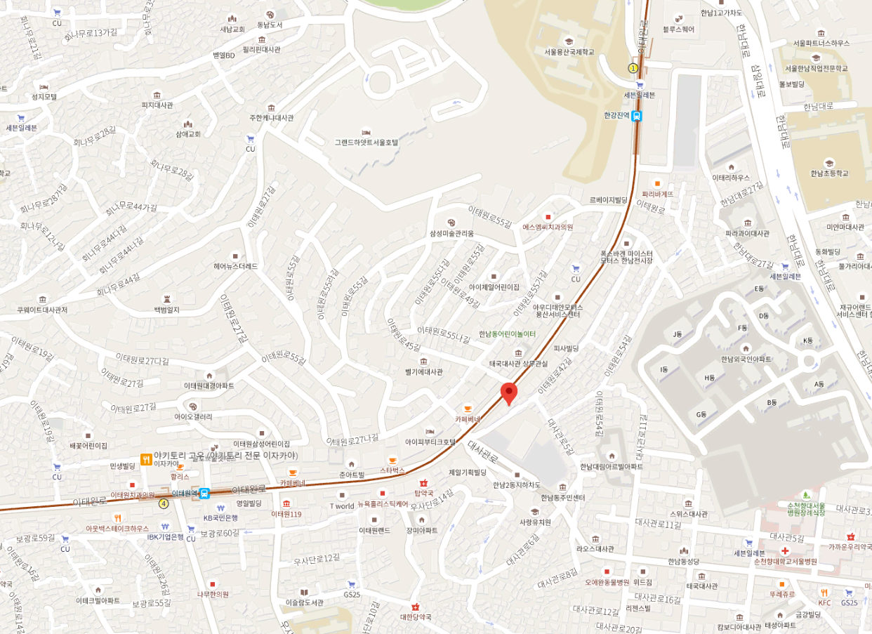 지하철 6호선 이태원역 3번 출구에서 제일기획 방향으로 도보 8분