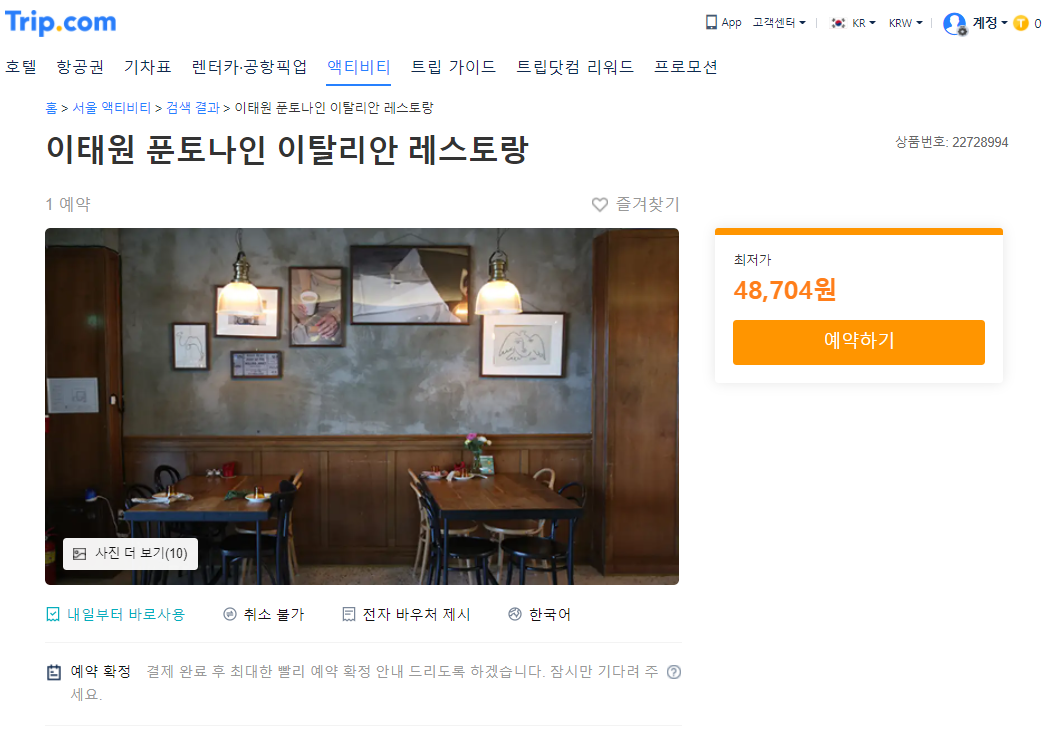 이태원 푼토나인 이탈리안 레스토랑은 트립닷컴온라인사이트에서 예약이 가능하여