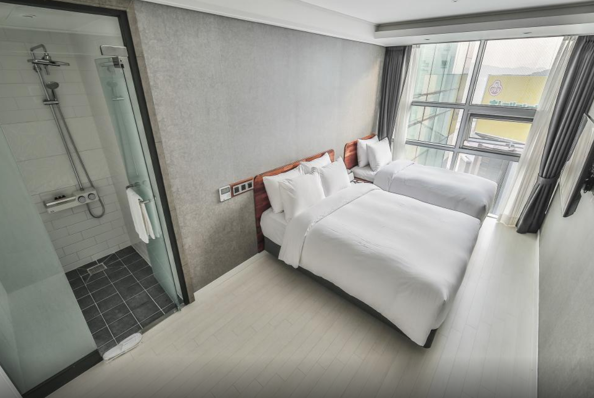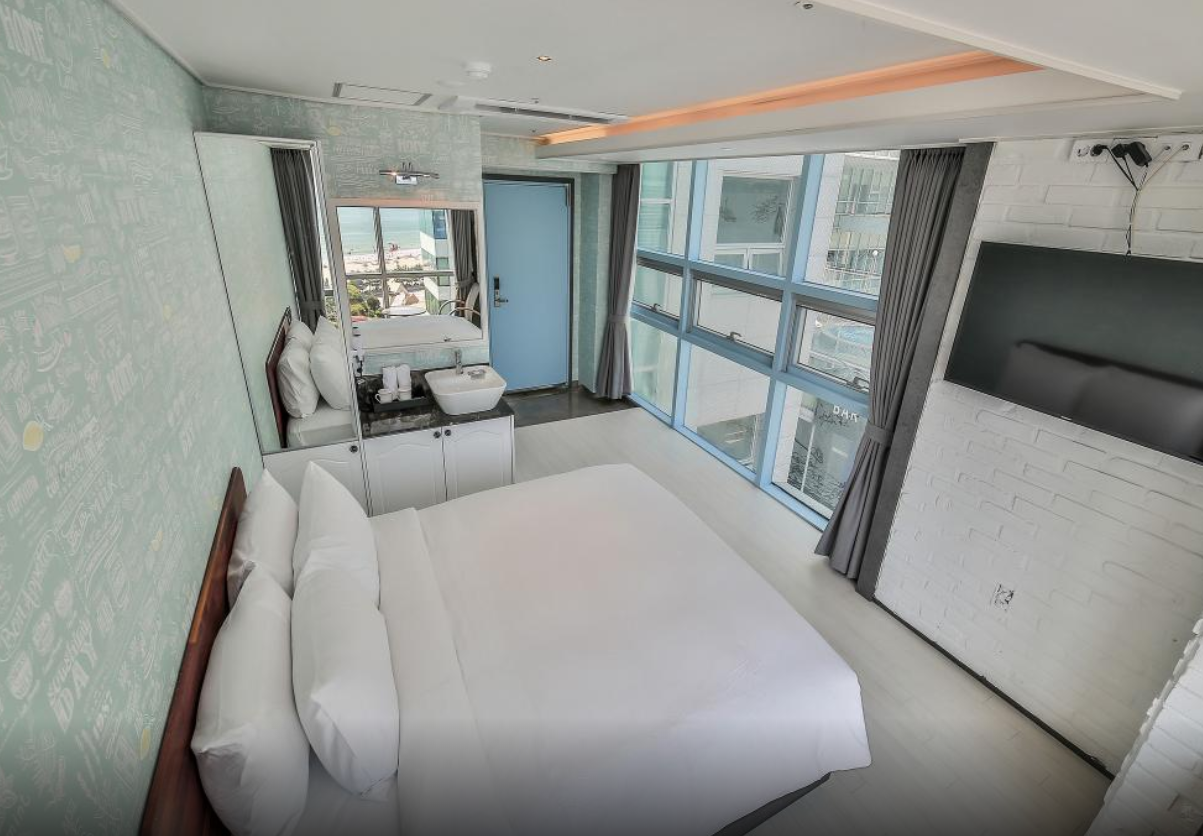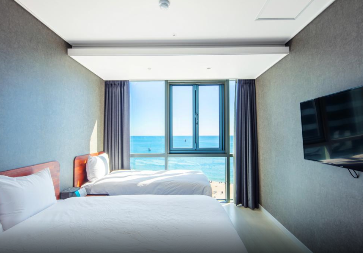 13층 트리플룸. (더블베드1+싱글베드1) 날씨가 좋아서 더 그랬는지 모르겠지만 통유리 인테리어로 해수욕장과 하늘이 정말 시원하게 탁 트여 보이는 방이었다. 방도 깨끗하고 따뜻한 물도 잘 나옴. 방은 넓지 않았지만, 2박 짧게 부산 여행 가는데 친구들끼리 3명이 쓰기 무리없었고, 근처 다른 호텔에 비해 가격대비 위치도 굉장히 좋은편(스타벅스 건물) 늦은 체크인임에도, 프론트 직원은 친절하게 대해주셨다. 나빴던 점은 샤워기에서 물 떨어지는 소리가 계속 나서 예민한 사람은 잠잘 때 빡칠수있다..ㅎㅎ 그리고 13층임에도 통유리라 그런지, 해운대 해수욕장에서 버스킹하거나 사람들이 소리지르는 소리가 약간 들리는 편. 호텔 복도에 사람들이 돌아다니거나 다른 방에서 문 여닫는 소리가 크게 들리는 편. 건물 전체가 호텔이 아니고 일부 층에서만 운영 중. 다음에 부산 여행 시 해운대 해수욕장 이용 계획이 있다면 또 숙박할 의향이 있다~!!