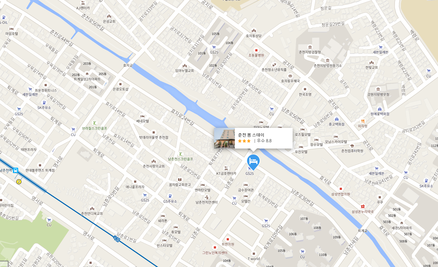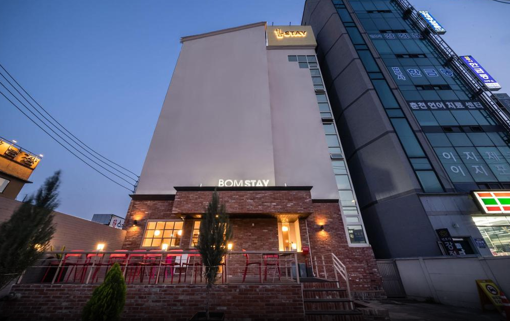 춘천시내의 심플하고 깨끗한 호텔 춘천 봄 스테이 (Chuncheon Bom Stay)는 주변에 숙박시설이 많이 모여있는 곳으로 춘천에서 가장 먹자골목인 일성아파트 주변 식당 들과도 가까우며 법원도 걸어서 이동가능한 거리로 남춘천역도 걸어서 조금 멀다 싶을 수는 있지만 그리 멀지 않고, 바로 옆에 춘천에서 핫한 루프탑 바, 커피숍이 있어 춘천여행시 여러모로 편리한 춘천호텔입니다. 객실은 필요한것만 딱 있는 심플한 분위기로 깨끗하게 이용하기 좋습니다.
