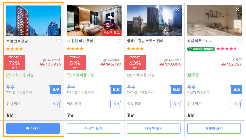 호텔 인 9 강남 (Hotel in 9 Gangnam)의 최저 가격대는 아고다에서 할인특가 가격으로 매일매일 변동되며 10만원대부터 다양하게 형성됩니다.아고다 최저가를 확인하시려면 아래 링크를 누르시면 원하는 날짜의 가격대를 자세히 보실 수 있습니다.