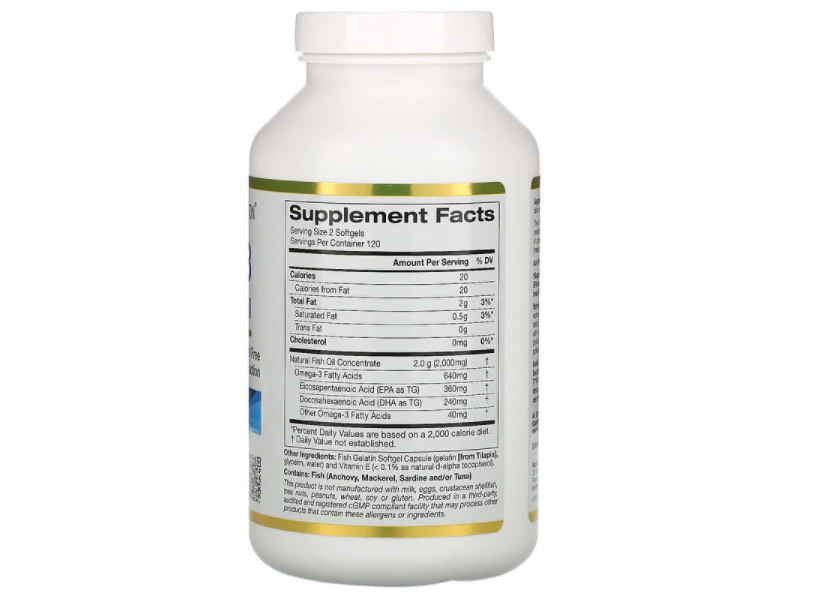 California Gold Nutrition의 오메가3 프리미엄 피쉬 오일은 분자 증류된 초임계 추출물로, 천연 피쉬 오일 농축액 2,000mg당 EPA 360mg 및 DHA 240mg을 함유하고 있습니다. 피쉬 젤라틴 소프트젤은 돼지 및 소 성분을 함유하고 있지 않으며 미국 캘리포니아에서 제조됩니다.