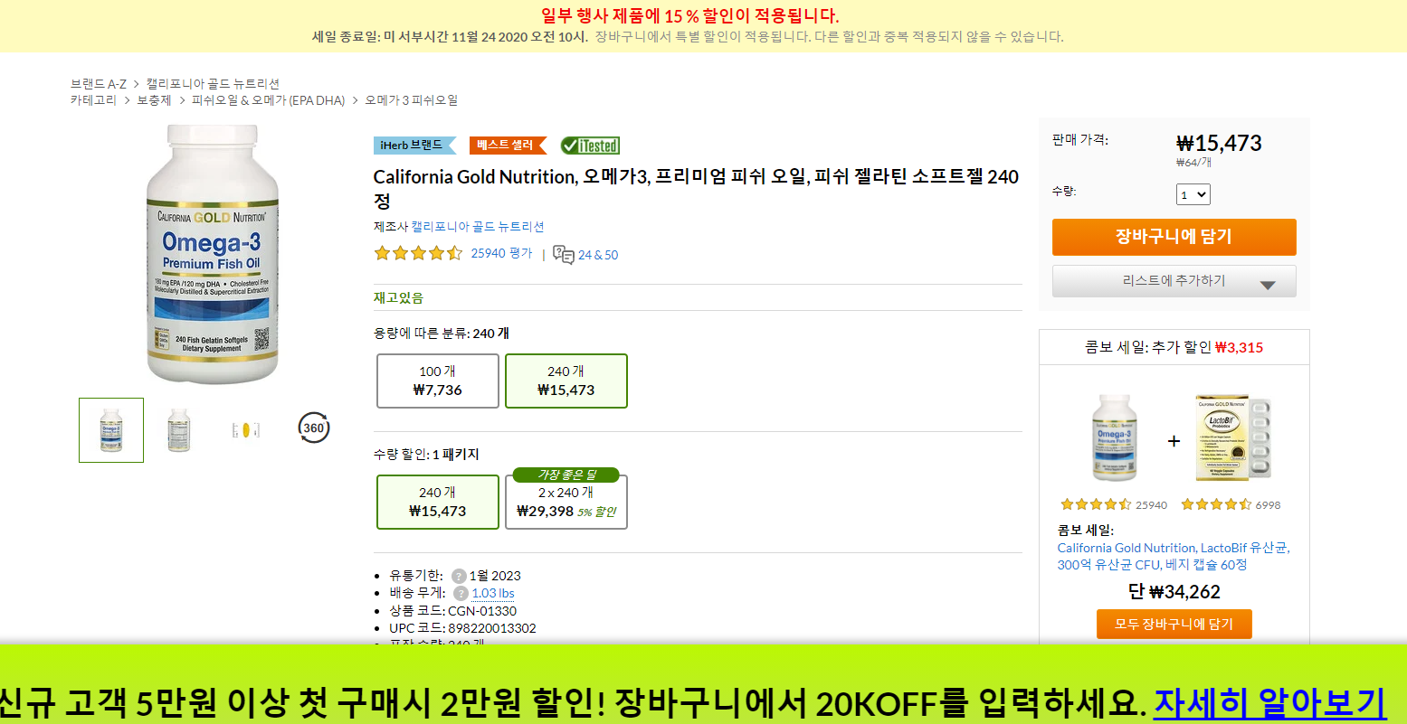 California Gold Nutrition, 오메가3, 프리미엄 피쉬 오일, 피쉬 젤라틴 소프트젤 240정 은 저렴하게 구매하실 수 있는 IHERB 사이트에서 판매하고 있으며 아이허브사이트에서 현재 15% 할인 및 신규고객 5만원 이상 첫 구매시 2만원할인코드 이벤트 진행중입니다. 신규고객할인코드는 장바구니에서 입력하시면 혜택을 받을 수 있습니다.