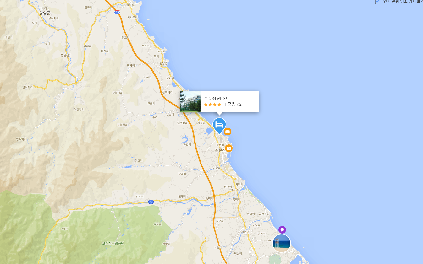 위치는 주문진 해수욕장 앞이라 위치는 맘에 들지만 주변에 먹을게 너무없어요. 조식은 그냥 그럽니다.