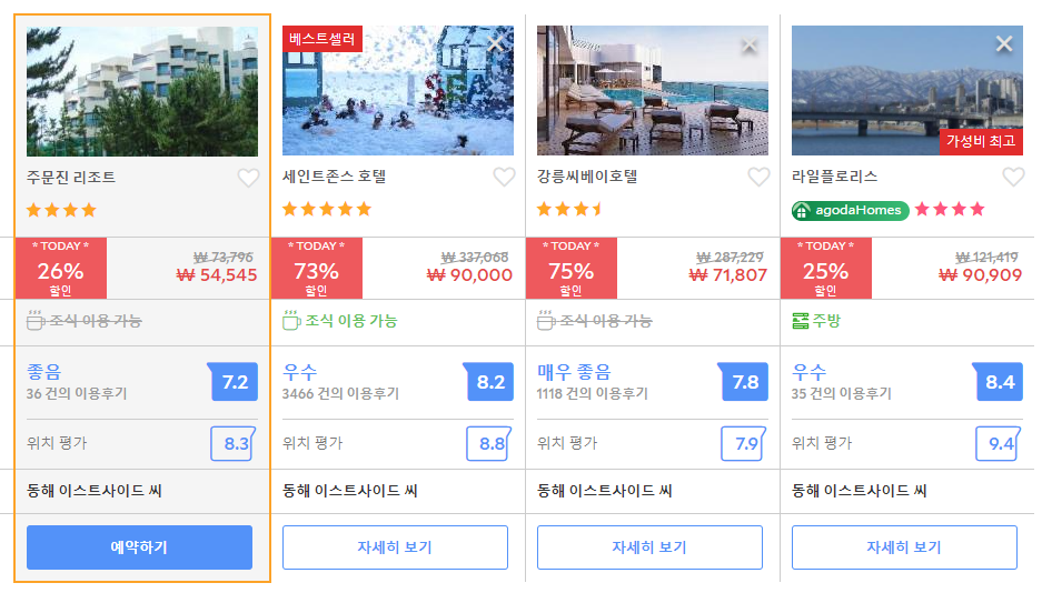 주문진 리조트의 최저 가격대는 아고다에서 할인특가 가격으로 매일매일 변동되며 10만원대부터 다양하게 형성됩니다.아고다 최저가를 확인하시려면 아래 링크를 누르시면 원하는 날짜의 가격대를 자세히 보실 수 있습니다.
