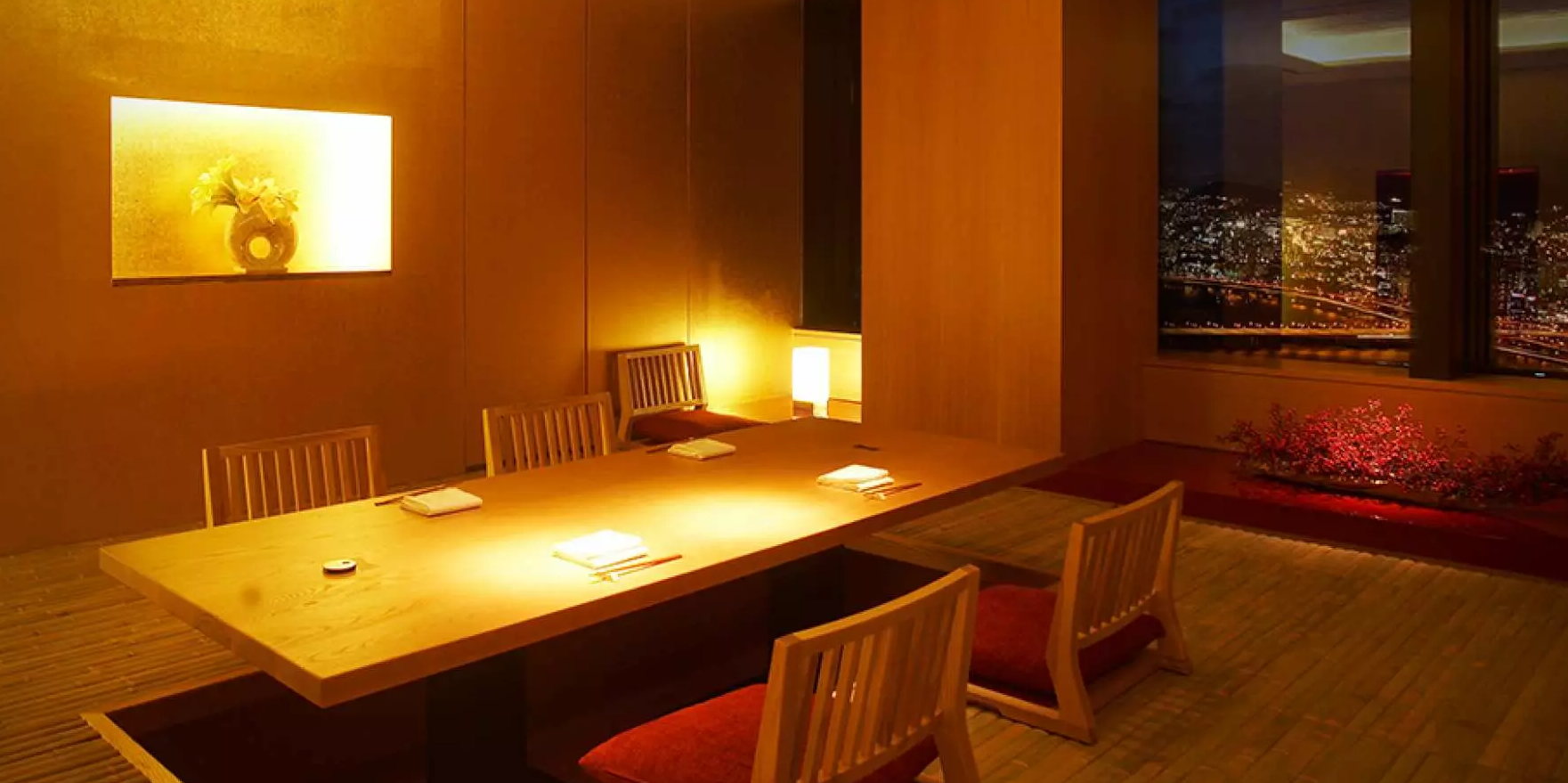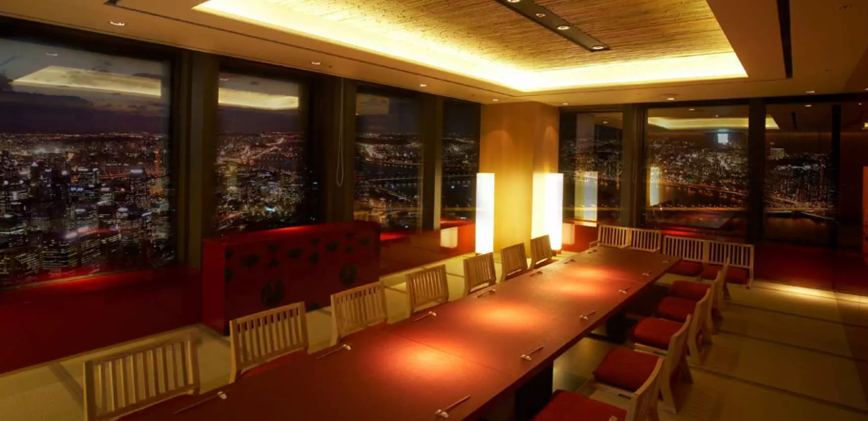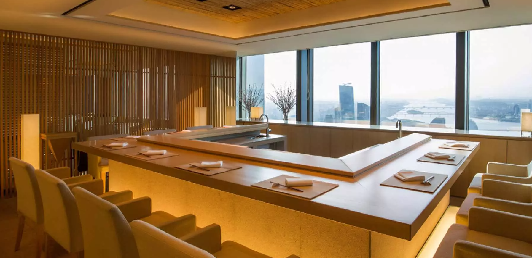 일본 기소 지방의 350년된 히노키로 제작된 스시바에서 서울 도심이 내려다 보이는 전망을