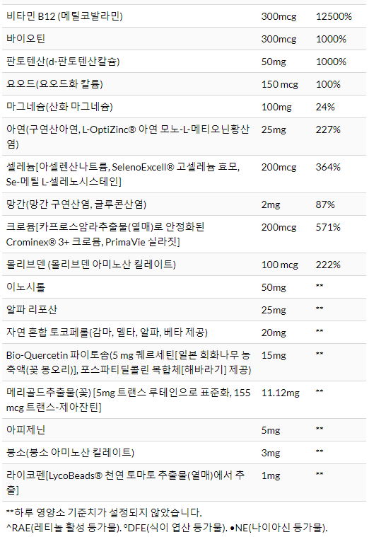 종합비타민은 무기질 및 건강한 삶에 필수적인 다른 영양소 없이 완성될 수 없습니다. 당사의 투 퍼 데이 포뮬라는 Centrum® Silver® 어덜츠 50+보다 10배 더 많은 비오틴 및 2배 더 많은 아연을 제공합니다. 또한 당사의 포뮬라는 마그네슘 100mg, 요오드 150mcg뿐만 아니라 망간 및 붕소와 같은 미량금속을 제공합니다.