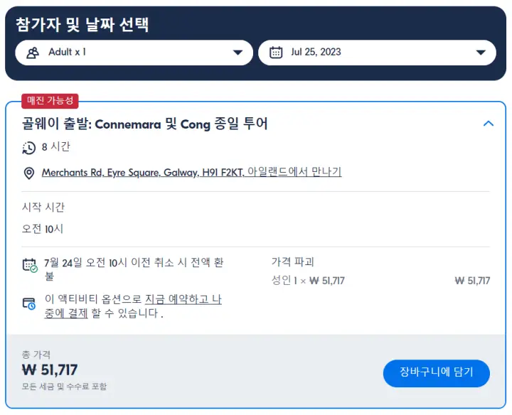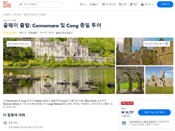 골웨이출발 Connemara 및 Cong 종일 투어(Connemara and Cong Full-Day Tour From Galway)는 GET YOUR GUIDE 사이트에서 예약하실 수 있습니다. 사이트는 특히 전 세계 대부분의 나라, 지역의 투어, 교통편 있어, 쉽게 찾을 수 없는 여행지의 다양한 투어 및 서비스를 이용할 수 있는 글로벌 사이트로 한국어사이트는 지원하지 않습니다. (글로벌 한국어 여행사이트를 찾으신다면 klook 여행사이트 추천합니다. 함께 사용하시면 더욱 편하게 여행하실 수 있습니다. klook에 찾는 정보가 없다면 GET YOUR GUIDE에서 찾으시면 됩니다.)