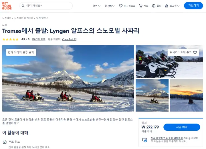 트롬쇠(Tromsø)에서 출발 Lyngen 알프스의 스노모빌 사파리 (Snowmobile Safari in the Lyngen Alps From Tromsø)는 GET YOUR GUIDE 사이트에서 예약하실 수 있습니다. 사이트는 특히 전세계 대부분의 나라, 지역의 투어, 교통편 있어, 쉽게 찾을 수 없는 여행지의 다양한 투어 및 서비스를 이용할 수 있는 글로벌 사이트로 한국어사이트는 지원하지 않습니다. (글로벌 한국어 여행사이트를 찾으신다면 klook 여행사이트 추천합니다. 함께 사용하시면 더욱 편하게 여행하실 수 있습니다. klook에 찾는 정보가 없다면 GET YOUR GUIDE에서 찾으시면 됩니다.)