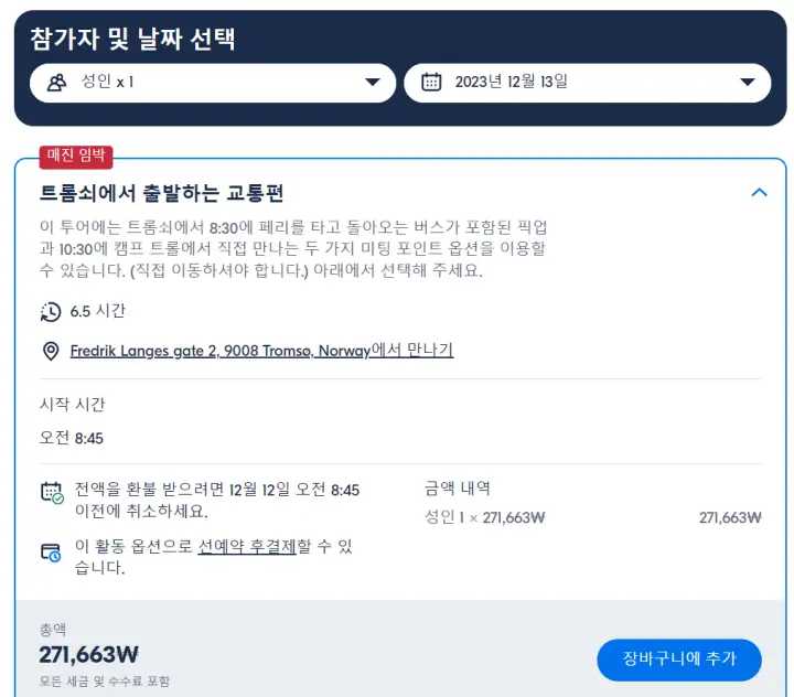 미팅 포인트 옵션을 선택한 경우 트롬소에서 환승