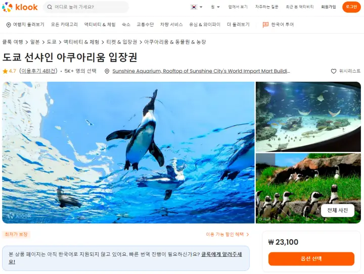 도쿄 선샤인 아쿠아리움 입장권은 클룩사이트에서 쉽게 예약하실 수 있으며, 현재 할인된 금액에 이용하실 수 있습니다.