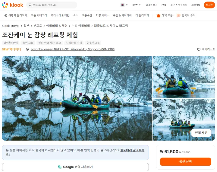 조잔케이 눈 감상 래프팅 체험은 클룩사이트에서 쉽게 예약하실 수 있으며, 현재 할인된 금액에 이용하실 수 있습니다.