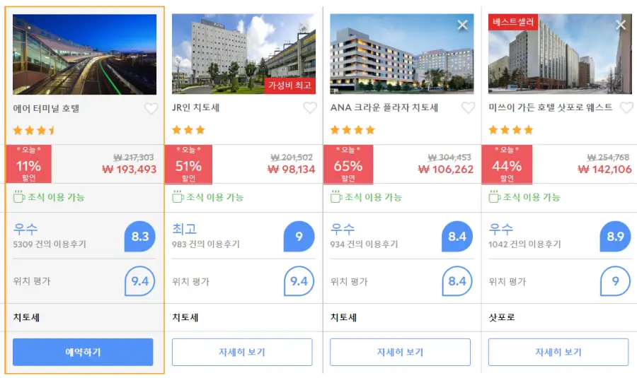 치토세 에어 터미널 호텔 (Air Terminal Hotel)의 최저 가격대는 아고다웹사이트에서 할인특가 가격으로 매일매일 변동되며 10만원대부터 다양하게 형성됩니다. 날짜별로 매일 가격이 다르므로 아고다웹사이트 최저가를 확인하시려면 아래 링크를 누르시고 원하는 날짜의 가격대를 선택해야 정확한 가격을 자세히 보실 수 있습니다.