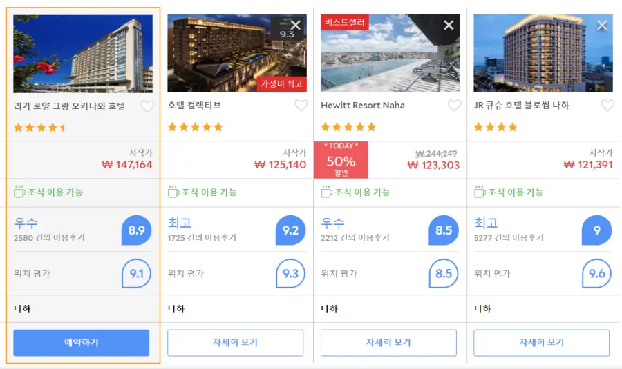 나하 리가 로얄 그랑 오키나와 호텔 (RIHGA Royal Gran Okinawa Hotel)의 최저 가격대는 아고다웹사이트에서 할인특가 가격으로 매일매일 변동되며 10만원대부터 다양하게 형성됩니다. 날짜별로 매일 가격이 다르므로 아고다웹사이트 최저가를 확인하시려면 아래 링크를 누르시고 원하는 날짜의 가격대를 선택해야 정확한 가격을 자세히 보실 수 있습니다.