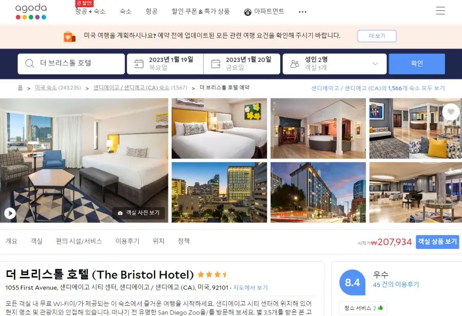 샌디에이고 더 브리스톨 호텔 (The Bristol Hotel)의 최저 가격대는 아고다웹사이트에서 할인특가 가격으로 매일매일 변동되며 10만원대부터 다양하게 형성됩니다. 날짜별로 매일 가격이 다르므로 아고다웹사이트 최저가를 확인하시려면 아래 링크를 누르시고 원하는 날짜의 가격대를 선택해야 정확한 가격을 자세히 보실 수 있습니다.