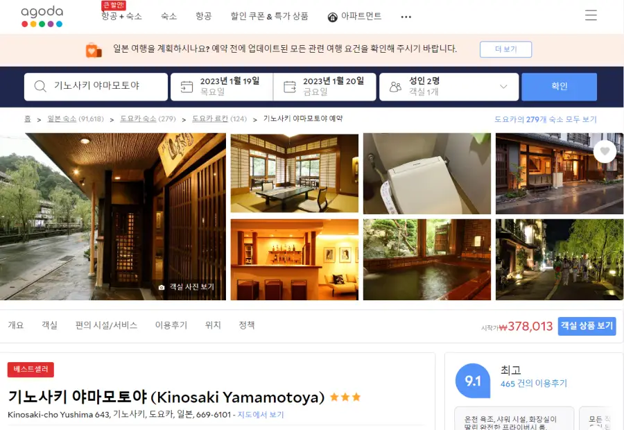 도요카 기노사키온천 료칸 야마모토야 (Kinosaki Yamamotoya)의 최저 가격대는 아고다웹사이트에서 할인특가 가격으로 매일매일 변동되며 10만원대부터 다양하게 형성됩니다. 날짜별로 매일 가격이 다르므로 아고다웹사이트 최저가를 확인하시려면 아래 링크를 누르시고 원하는 날짜의 가격대를 선택해야 정확한 가격을 자세히 보실 수 있습니다.