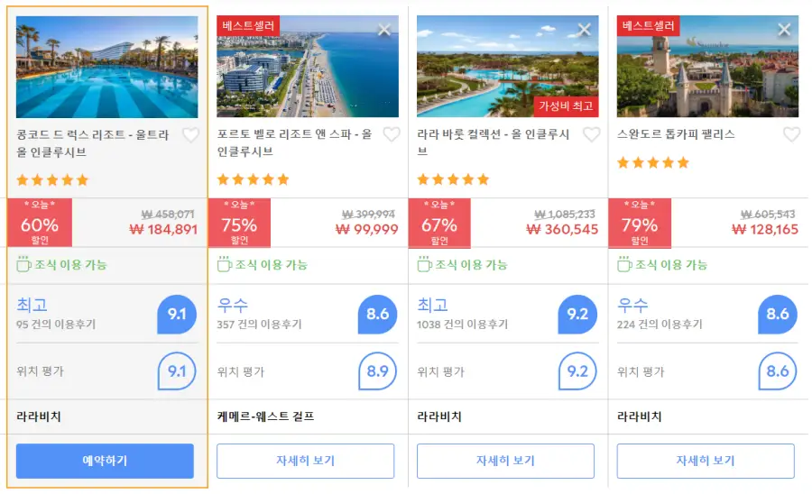 안탈리아 콩코드 드 럭스 리조트 울트라 올 인클루시브 (Concorde De Luxe Resort Ultra All Inclusive)의 최저 가격대는 아고다웹사이트에서 할인특가 가격으로 매일매일 변동되며 10만원대부터 다양하게 형성됩니다. 날짜별로 매일 가격이 다르므로 아고다웹사이트 최저가를 확인하시려면 아래 링크를 누르시고 원하는 날짜의 가격대를 선택해야 정확한 가격을 자세히 보실 수 있습니다.