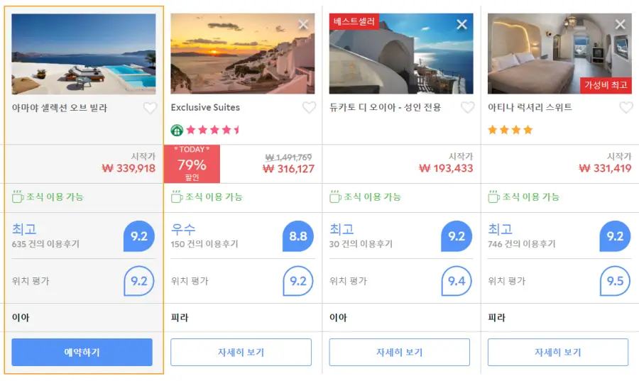 산토리니호텔 아마야 셀렉션 오브 빌라 (Amaya Selection of Villas)의 최저 가격대는 아고다웹사이트에서 할인특가 가격으로 매일매일 변동되며 10만원대부터 다양하게 형성됩니다. 날짜별로 매일 가격이 다르므로 아고다웹사이트 최저가를 확인하시려면 아래 링크를 누르시고 원하는 날짜의 가격대를 선택해야 정확한 가격을 자세히 보실 수 있습니다.