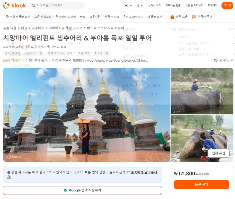 치앙마이 엘리펀트 생추어리 & 부아통 폭포 일일 투어는 클룩사이트에서 쉽게 예약하실 수 있으며, 현재 할인된 금액에 이용하실 수 있습니다.