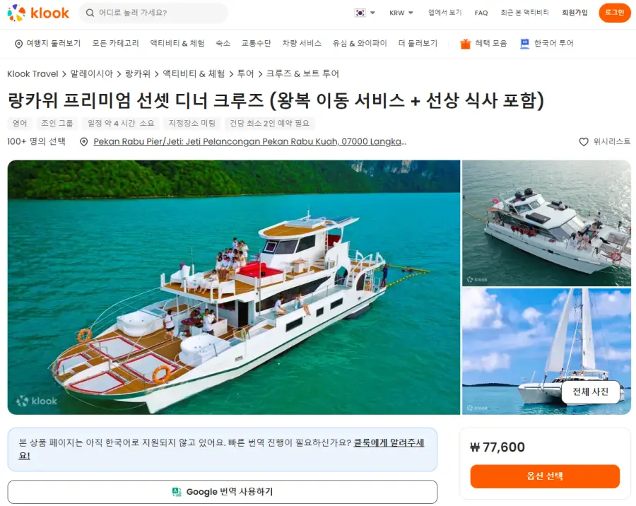 랑카위 안다만해 일몰감상과 디너크루즈는 클룩사이트에서 쉽게 예약하실 수 있으며, 현재 할인된 금액에 이용하실 수 있습니다.